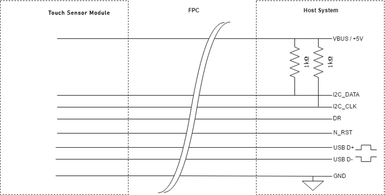 Interface ConfigurationThe Touch Sensor Module provides two interfaces for communication with the host system, I2C and USB HID-device. The user can choose to connect one of them, or both. The typical Touch Sensor Module connection to a host system is shown in the following diagram: