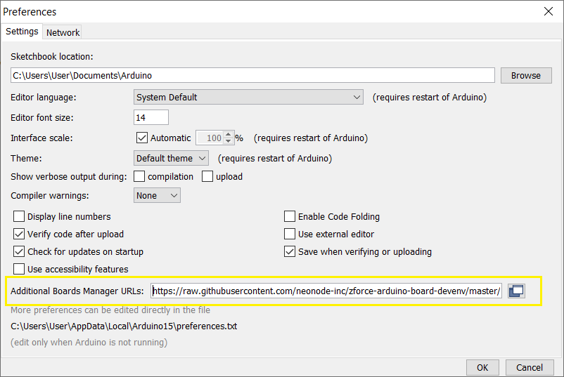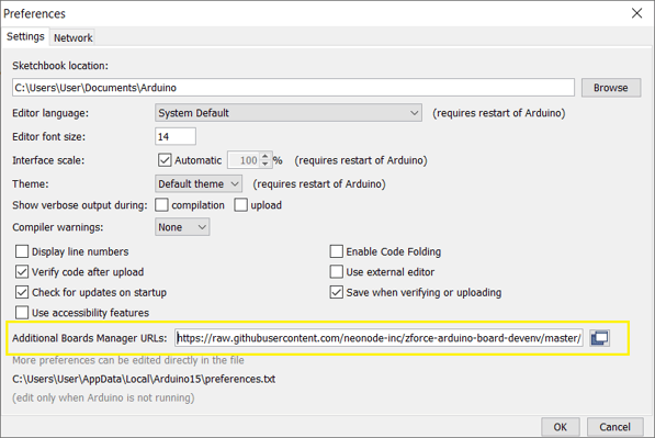 2. in Preferences, navigate to Additional Boards Manager URLs and include the following URL: https://raw.githubusercontent.com/neonode-inc/zforce-arduino-board-devenv/master/package_neonode_index.json