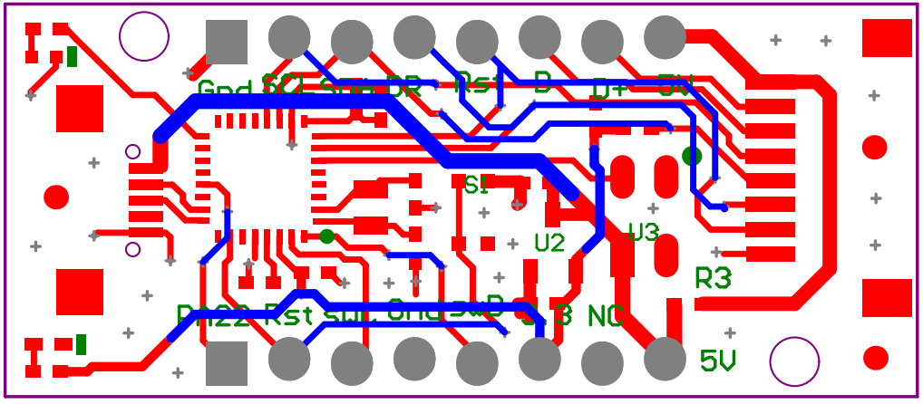 - 2 rows of 8x 2.54mm (0.1") pitch pin header holes, with a special design to accept friction fixing for connecting a pin header to a breadboard or other interface boards.