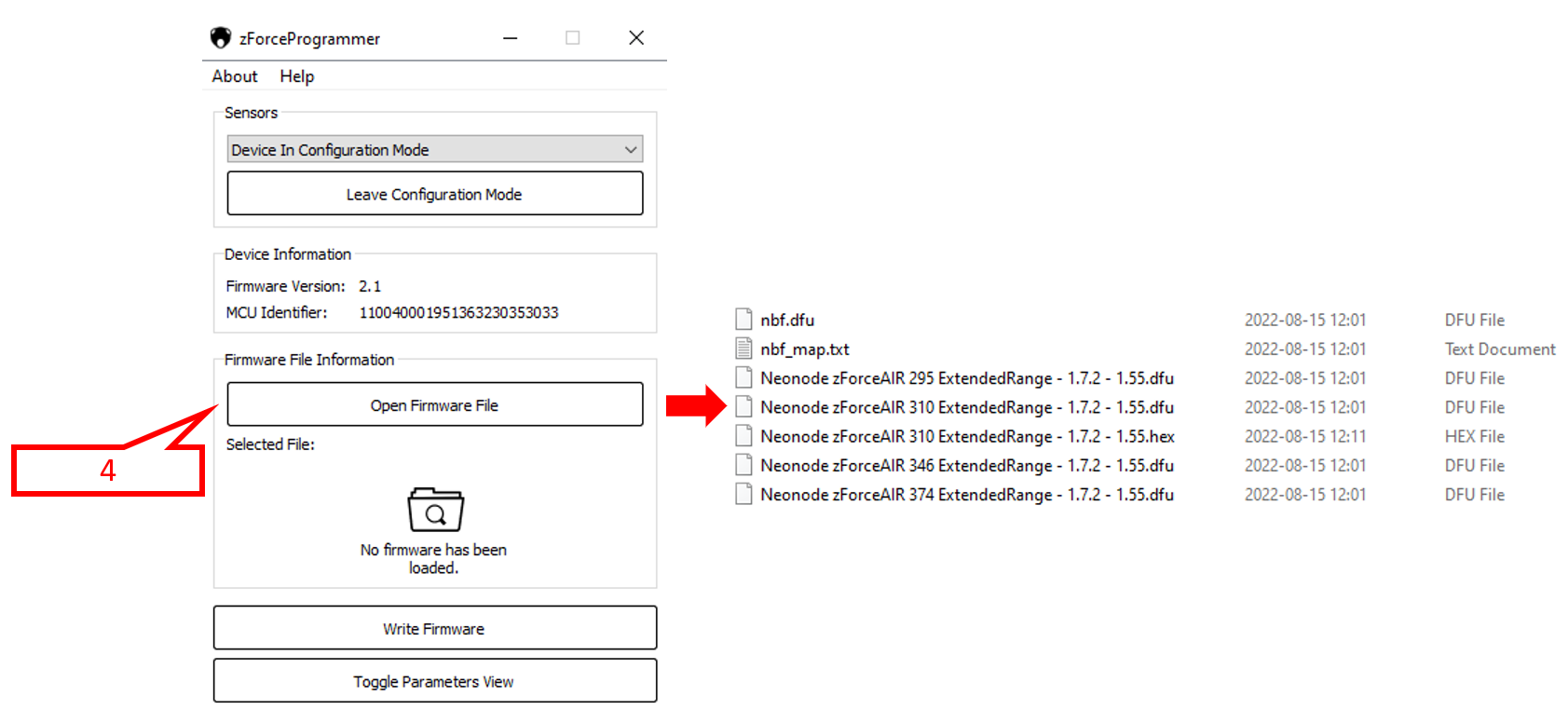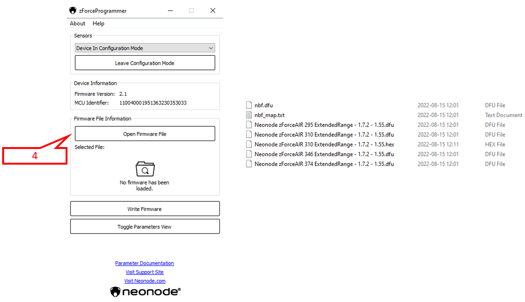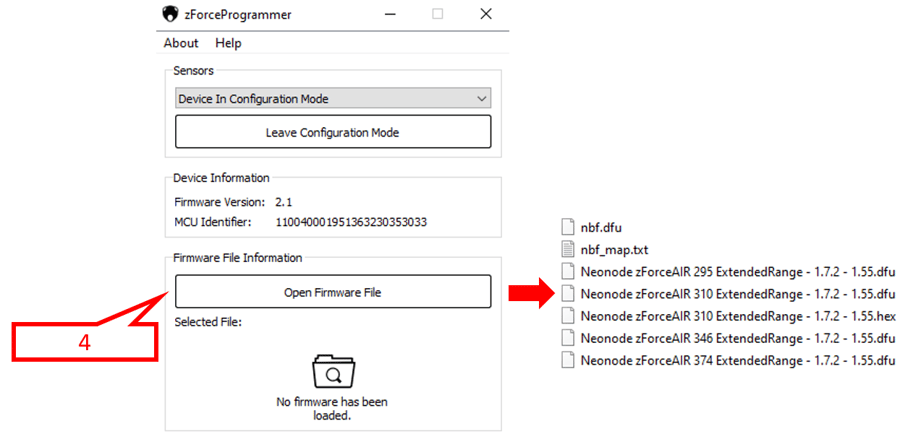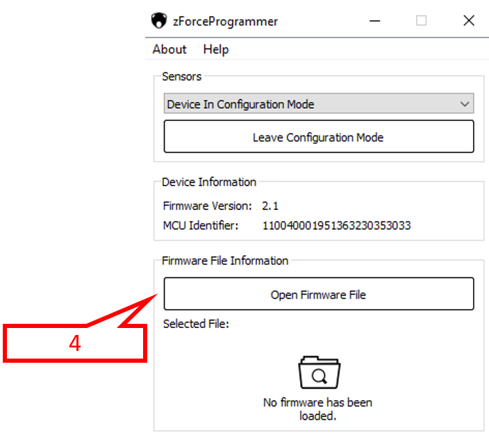 4. Open zForceProgrammer, click Open Firmware File and go to the newly extracted folder and select the right firmware for your sensor.