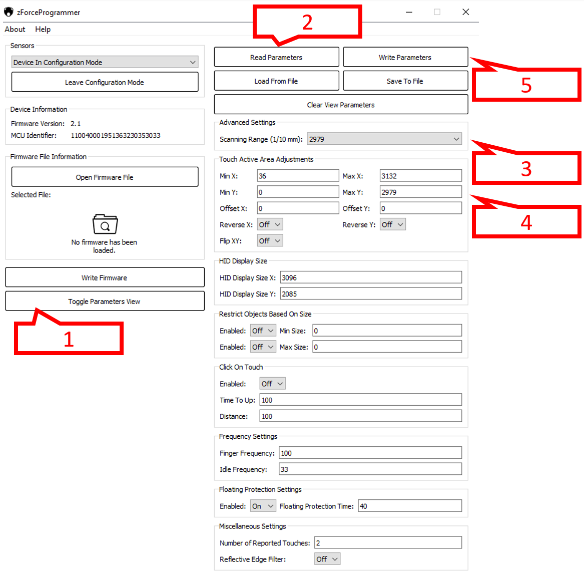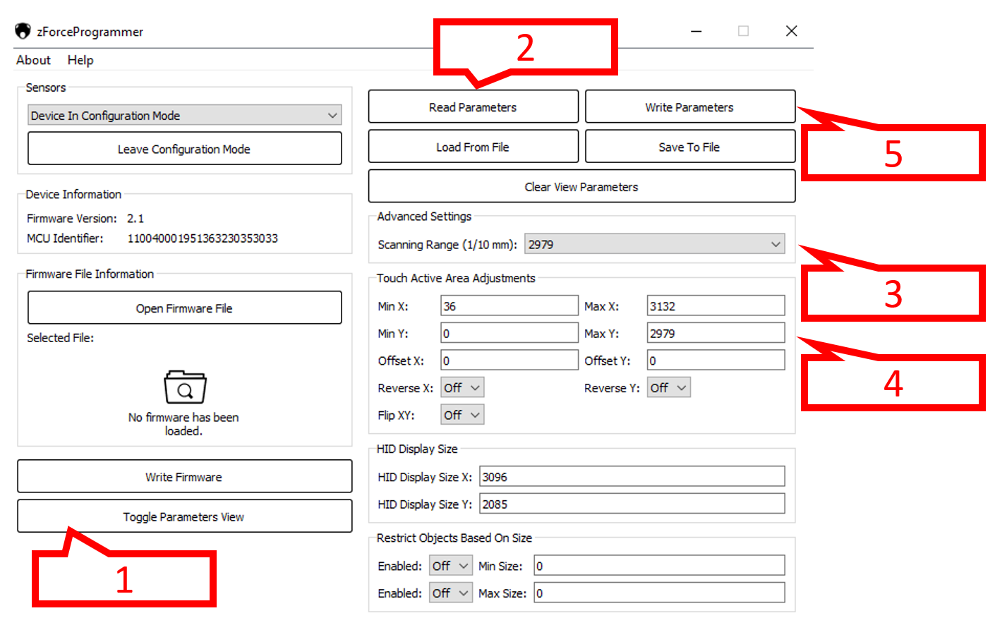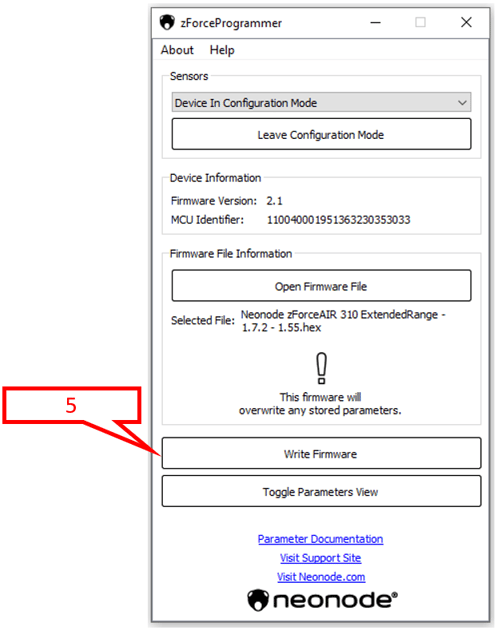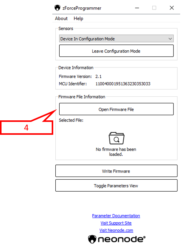 4. Open zForceProgrammer, click Open Firmware File and go to the newly extracted folder and select the right firmware for your sensor.