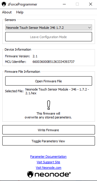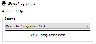 The Default view of the zForceProgrammer when a sensor is plugged in looks like in picture below: