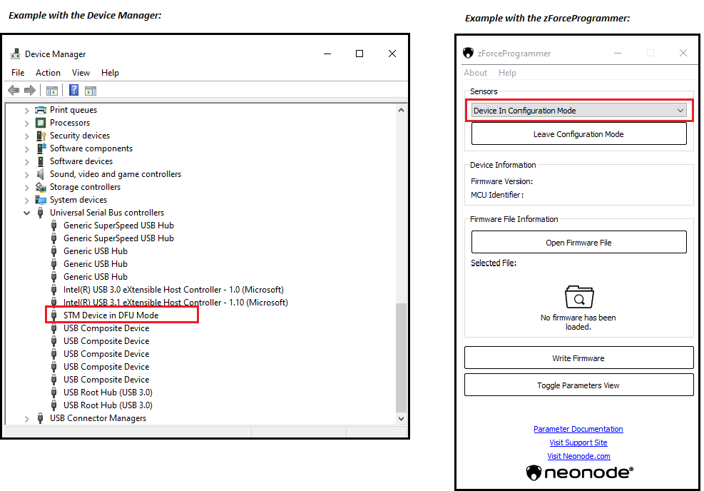 - See if the sensor is detected in the Device Manager. Alternatively, if you have these applications open see if you can see the sensor in the Workbench or in the zForceProgrammer.