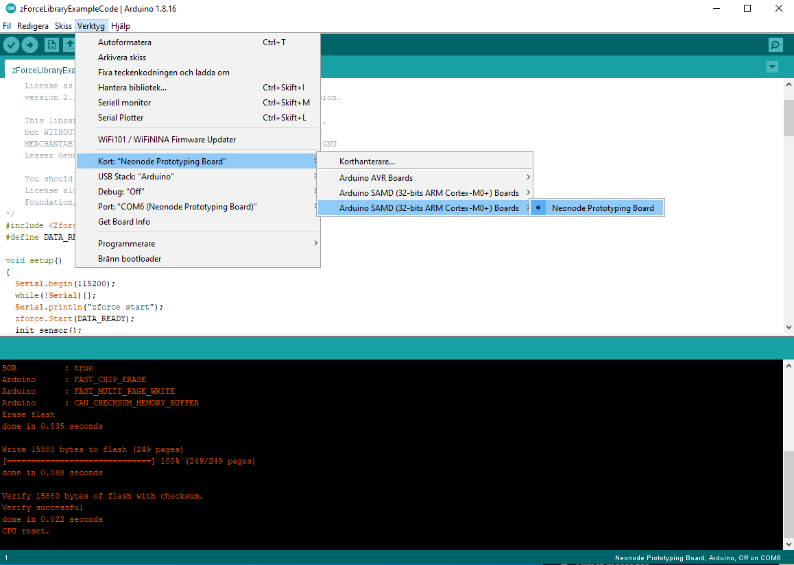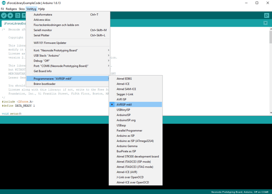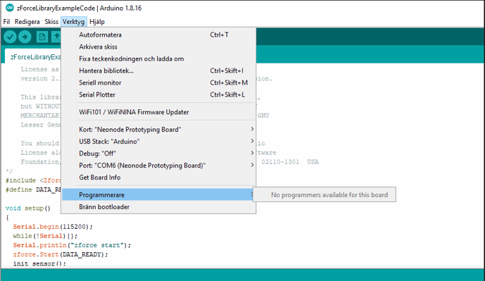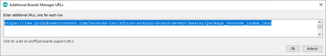 Verify that you have added the “Neonode Prototyping Board” URL to the “Additional Boards Manager” under “File >> Preferences” in the IDE: