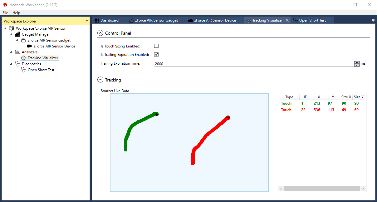 Status or error information appear on occasion in the top center of the Workbench application. For example, a status notification appears when a Touch Sensor Module (previously referred to as zForce AIR) is connected or disconnected.