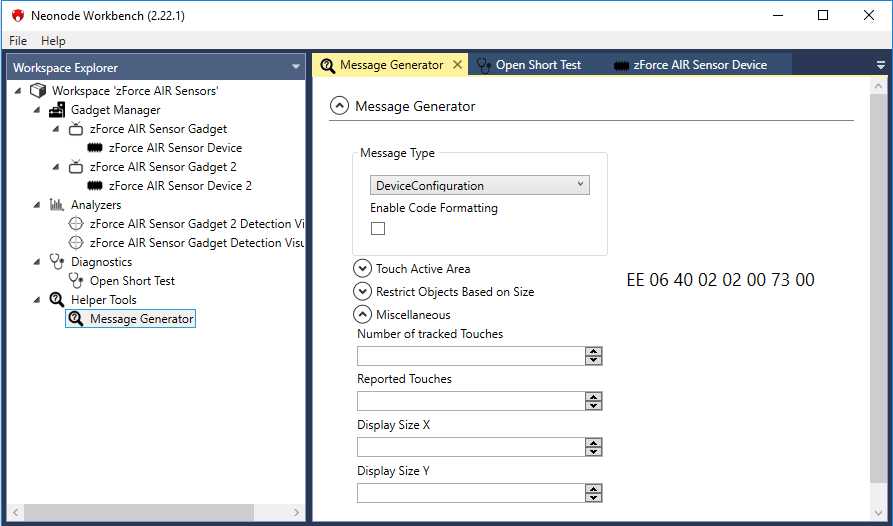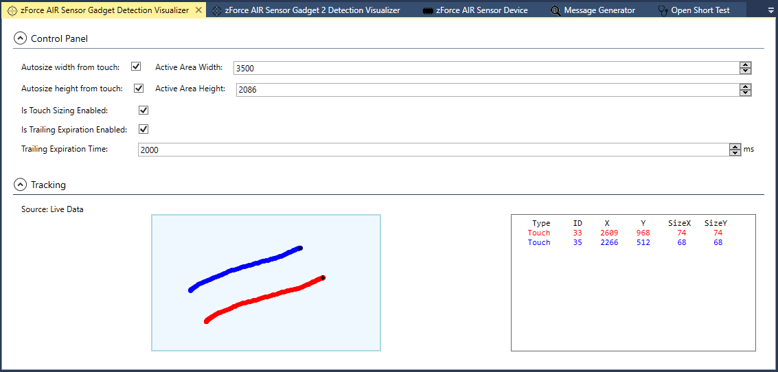 In the left panel, double-click the item zForce AIR Sensor Gadget. The sensor module information such as firmware version, protocol version, etc shows in the right panel.In the left panel, double-click the item zForce AIR Sensor Device. Two sections, Control Panel and Device Configuration, show in the right panel.