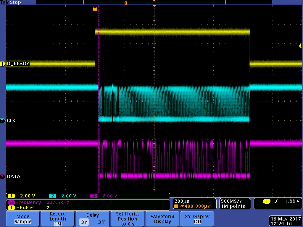 PIN 3 can be used as an interrupt input or it can be read repeatedly by the host. When the pin is set to high, the FW will wait for the host to read data from the I2C bus. When the read transaction is finished, this Data Ready signal will be reset automatically by the sensor module. The following figure shows the timing behavior of a typical I2C transaction: