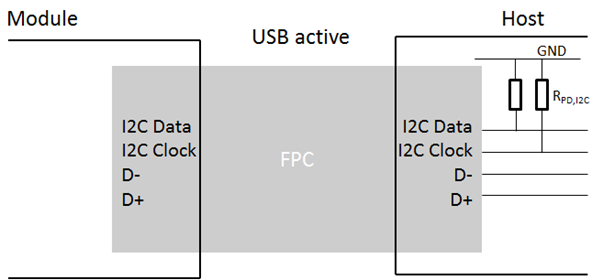 The Touch Sensor Module provides an I2C interface through its 8-pin connector. The interface runs in fast mode, which means the speed is 400kbps. With this interface, more advanced configuration could be performed. PIN 1, 3, 4, 5, 8 ( GND, DR, I2C_DATA, I2C_CLK, VBUS ) are used for this connection. It is recommended to use two 1k? pull-up resistors to tie up I2C_DATA and I2C_CLK pins to VBUS or 3.3V power supply to perform proper I2C communication. If USB connection is not used in parallel, PIN 6, 7 ( USB D-, USB D+ ) could be left unconnected.