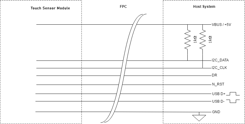 Interface ConfigurationThe Touch Sensor Module provides two interfaces for communication with the host system, I2C and USB HID-device. The user can choose to connect one of them, or both. The typical Touch Sensor Module connection to a host system is shown in the following diagram: