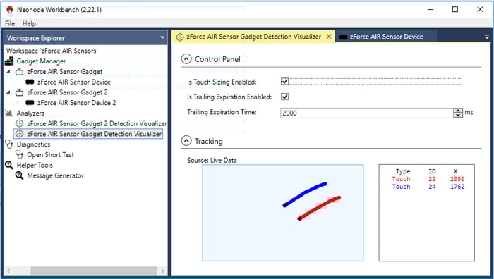 - In the left panel of the workspace, double-click zForce AIR Sensor Gadget Detection Visualizer. A tab with two sections, Control Panel and Tracking, opens in the right panel.