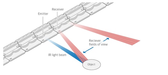 zForce AIR Touch Sensors detect and trace objects by detecting diffusely reflected infrared light. The sensor comprises an optical system arranged to combine emitted IR beams and receiver fields of view within the same apertures. IR light beams are emitted perpendicular to the output window, while receivers field of view is centered at a certain angle left and right.