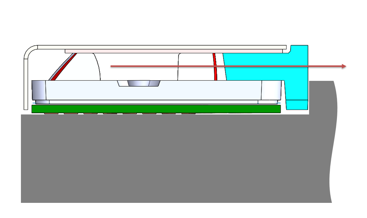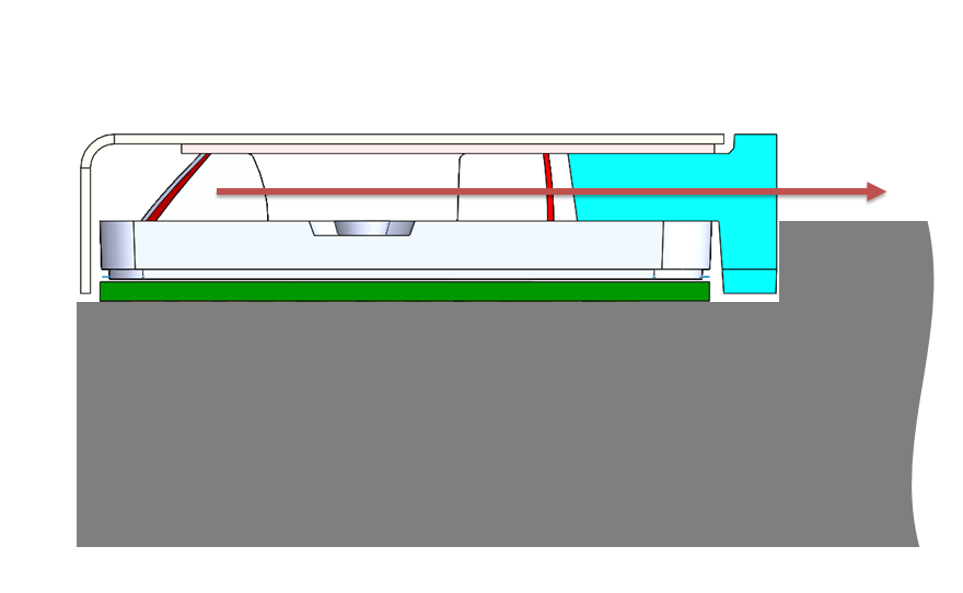 When integrating zForce AIR Touch Sensor into a host system make sure not to interfere with the light path. For horizontal integration, the opening for the sensors light path must be minimum 1.4 mm.