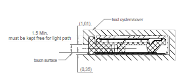 To make sure not to interfere with the sensor light path, the opening must be minimum 1.6 mm. If the host system has large tolerances, the opening must always be adjusted to be minimum 1.6 mm. Also note that it is not allowed to mount, glue or in any other way affect the sensor's optical surfaces since it will affect the performance. This applies to both the sensor's visible optical surface and the back of the mirror surface that bends the light path 90°.