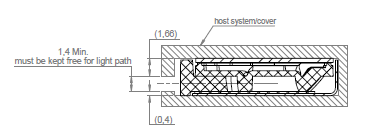 To make sure not to interfere with the sensor light path, the opening must be minimum 1.6 mm. If the host system has large tolerances, the opening must always be adjusted to be minimum 1.6 mm. Also note that it is not allowed to mount, glue or in any other way affect the sensor's optical surfaces since it will affect the performance. This applies to both the sensor's visible optical surface and the back of the mirror surface that bends the light path 90°.