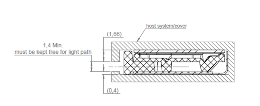 To make sure not to interfere with the sensor modules light path, the opening must be minimum 1.6 mm. If the host system has large tolerances, the opening must always be adjusted to be minimum 1.6 mm. Also note that it is not allowed to mount, glue or in any other way affect the sensor module's optical surfaces since it will affect the performance. This applies to both the module's visible optical surface and the back of the mirror surface that bends the light path 90°.