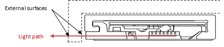 An external reflective surface is a surface located outside the active area, but close enough to be reached by the IR light emitted by the sensor module. Depending on the angle and the reflectance of the surface, reflected light can enter the sensor module and interfere with touch object detection. If the external reflective surface is close to the touch active area, it is recommended to make sure it has a low reflectance in the direction back towards the sensor module.