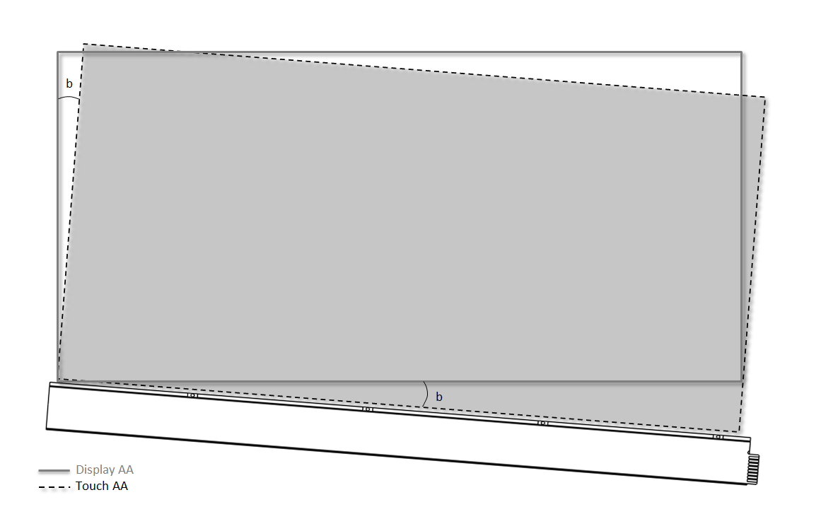 The angle "b" is defined as shown in the image below. How sensitive the Touch Sensor Module is for assembly rotations is directly linked to the size. At any given angle b, the Touch Active Area will be tilted twice as much at 200 mm compared to at 100 mm.