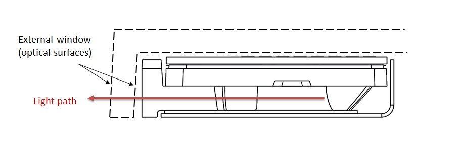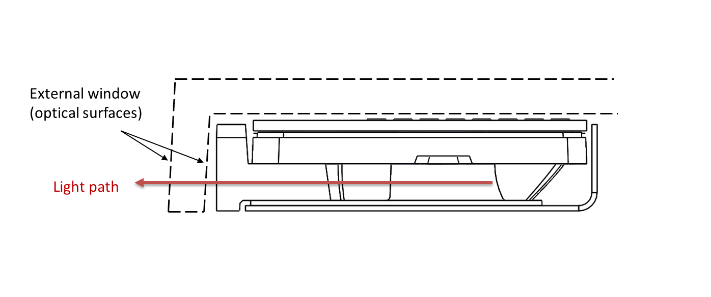 External WindowAn external window is something placed between the sensor module and the desired touch active area, usually in form of a plastic or glass “window”. It is of high importance for the function that these surfaces fulfill the optical demands stated in Optical Requirements on External Optical Surface. It is important to know that each window the light passes through will reduce the sensor modules received signal levels, even though the requirements are fulfilled, which in some applications might reduce the maximum detection range.