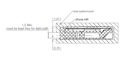 To make sure not to interfere with the sensor modules light path, the opening must be minimum 1.6 mm. If the host system has large tolerances, the opening must always be adjusted to be minimum 1.6 mm. Also note that it is not allowed to mount, glue or in any other way affect the sensor module's optical surfaces since it will affect the performance. This applies to both the module's visible optical surface and the back of the mirror surface that bends the light path 90°.