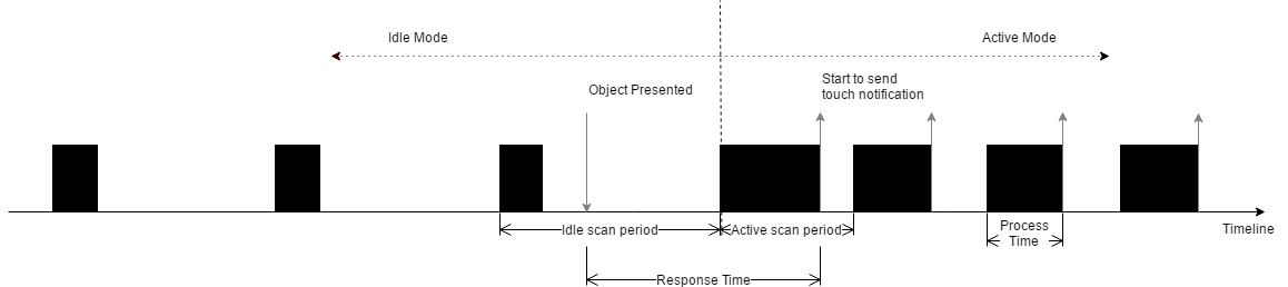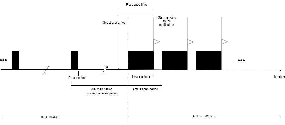 The specified response time for the initial touch starts from the instant an object is presented in the sensor's active area and stops when the sensor starts to send the first touch notification for this object. The specified response time consists of two numbers reflecting the best case and the worst case, with the average response time right in the middle.