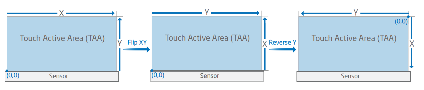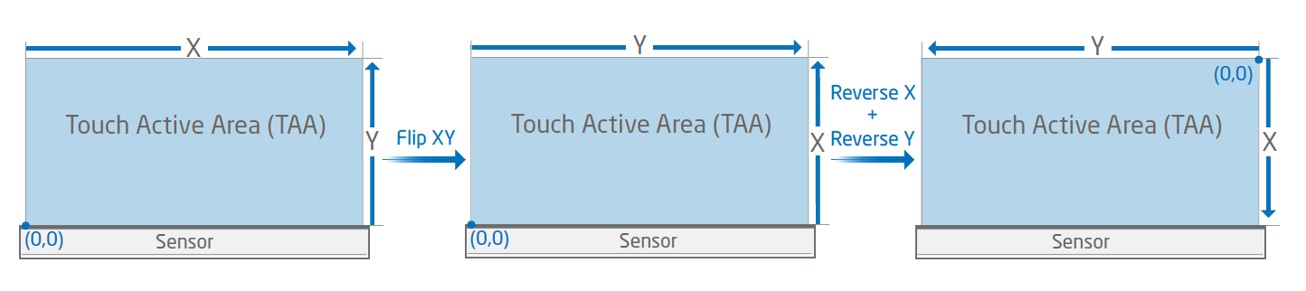 When mapping a reported touch from the Touch Active Area to a display, it is important that the orientation of the TAA, as well as the display are taken to account. When positioning a Touch Sensor Module over a display to achieve touch functionality, both systems needs to be co-aligned in order for a reported touch to be projected in the same corresponding position of the screen. If both systems are not oriented in the same way, the reported touches are going to be reversed depending of the setup. Luckily, the orientation of the reported touches can be configured to counter this by using ReverseX/ReverseY or FlipXY in Device Configuration. These settings rotates/flips the given coordinates of the reported touches, which allows a more setup variations.