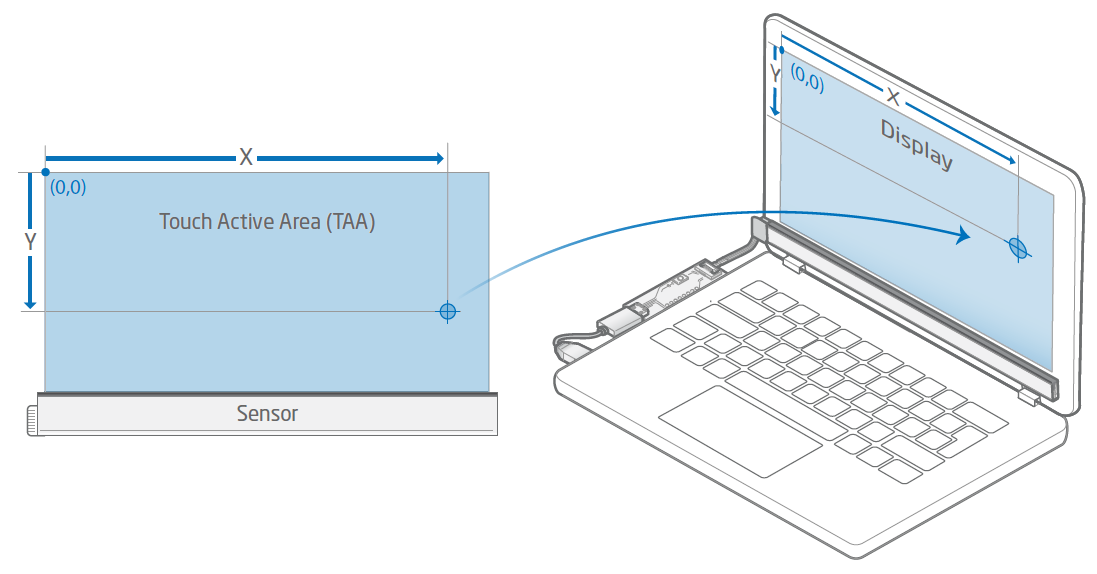 Almost all displays (OS) have their origin positioned at the upper left corner of the screen, where the x-axis points in the direction to the right, with the y-axis pointing downwards. The origin of the sensor module's Touch Active Area is positioned on the left hand side, when having the TAA facing downwards, where the black side of the sensor module facing outwards.