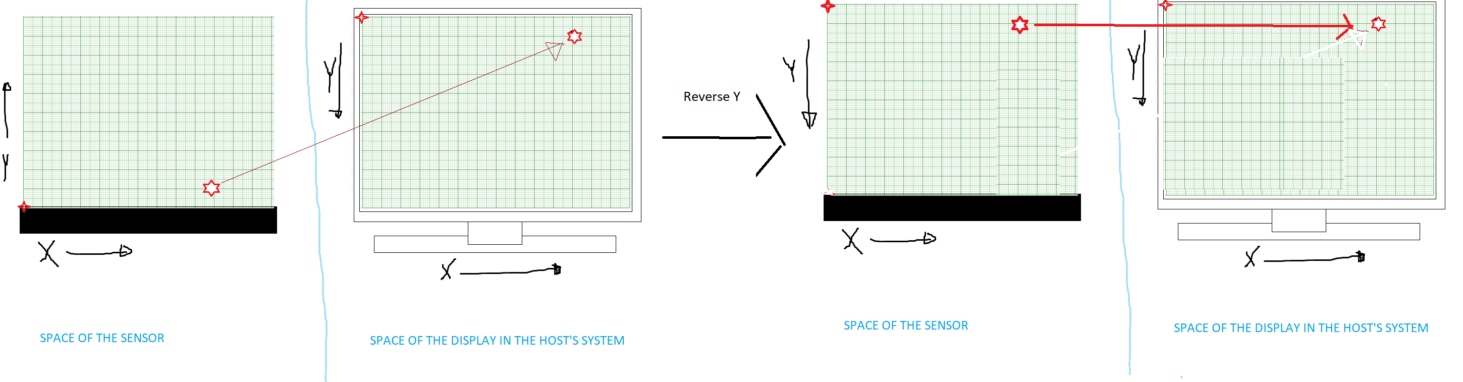 This means that if a sensor module is positioned above a display, with the black side facing outwards, and its TAA covering the screen - Both coordinates systems would be co-aligned and a reported touch would project on the display seamlessly. But if we were to flip the sensor module to cover the screen from underneath the display, a reported touch would appear to be reversed in y-direction since their coordinate systems would no longer be co-aligned, as illustrated below.