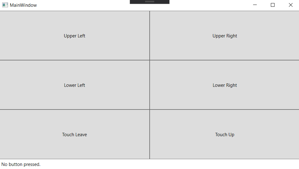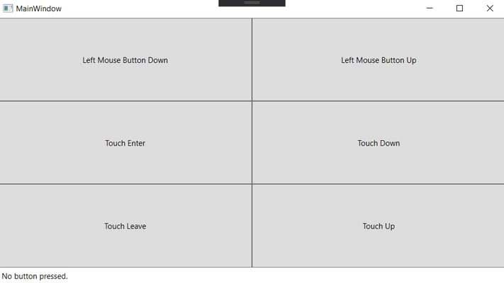 The WPF Touch Device Handling Application both reads and separates TOUCH- from MOUSE events. The application contains of 6 buttons that triggers from different touch- or mouse events. A text is printed in the lower left corner to indicate when a button has been fired, and by what event. The application can be used to test out the effects of the different touch events. The application code is available for reference, which is created in the framework WPF.