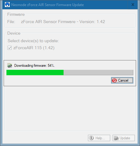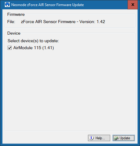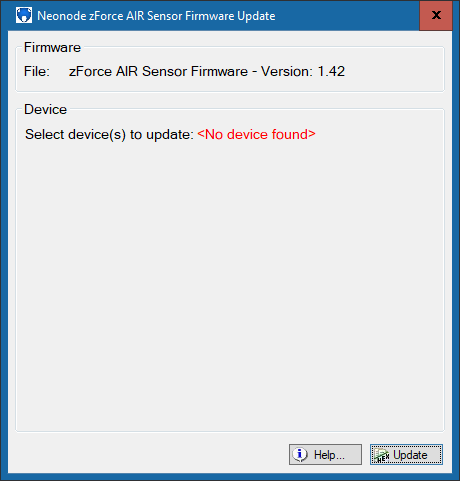 To update the firmware on a zForce AIR sensor, zForce AIR Sensor Firmware Update for Windows is used. The package that contains the firmware update application and the relevant firmware can be found in Downloads.