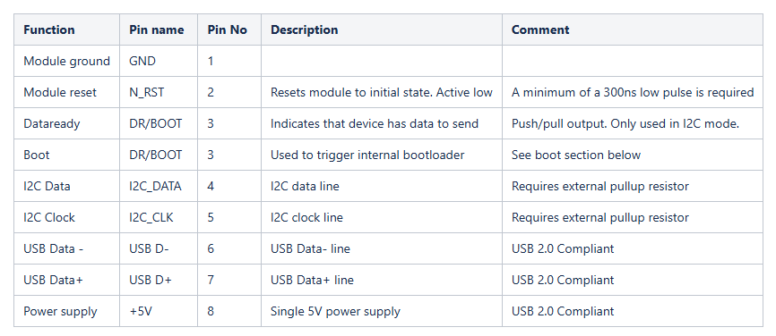 The module can either be configured as an I2C- or an USB HID-device. It has 8 contact pads, compatible with a standard FFC-connector with 1 mm in pitch. The host needs to be connected to all 8 pads even though only I2C or USB HID is used.