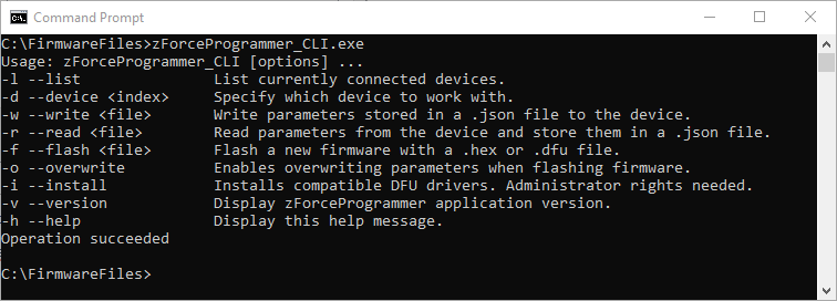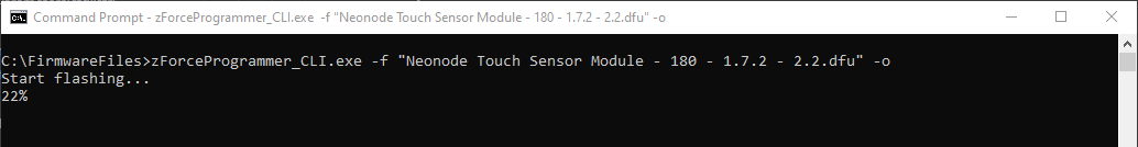 To flash a new firmware onto the sensor, use the CLI command together with the -f (flash) command and give the path to the firmware as an argument to the -f command.