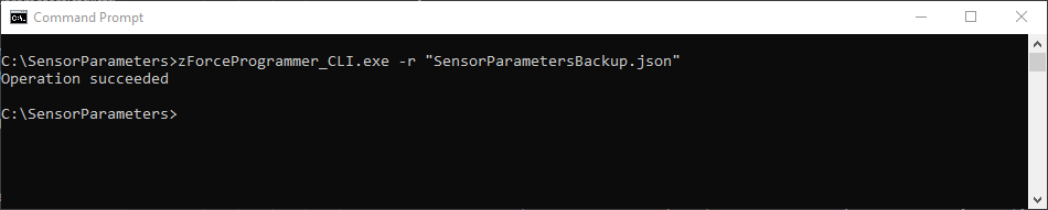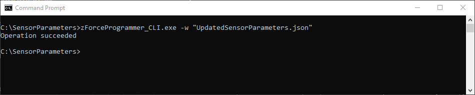 Use the -w parameter to write parameters in a json file to the sensor. Provide the path to the json file containing the parameter values as an argument to the -w command. No path is needed if the CLI command is executed in the directory of the json file given as argument.