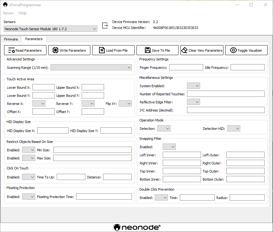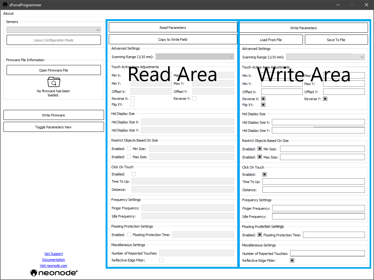 If the firmware currently installed in the active sensor does not support some of the new parameters available in the zForce Programmer graphical interface, these parameters will be grayed out and disabled in the user interface and therefore not available to configure.