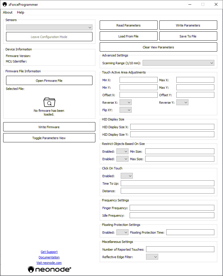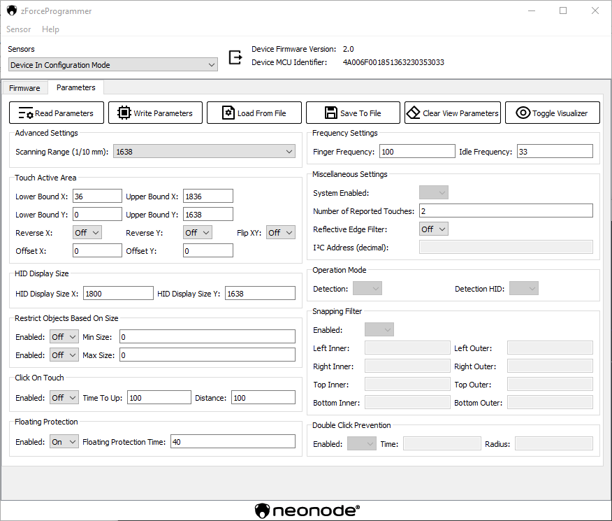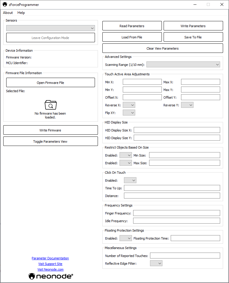 While the sensor is in the configuration mode it will not report any touches or have any other functionality enabled. It is not possible for the application to read the firmware version when the sensor is in configuration mode which means that it's not possible to read or write parameters if the sensor was connected in configuration mode. To fix this, either press the Leave Configuration Mode button if the sensor has a working firmware that supports parameters or write a new firmware that supports parameters.