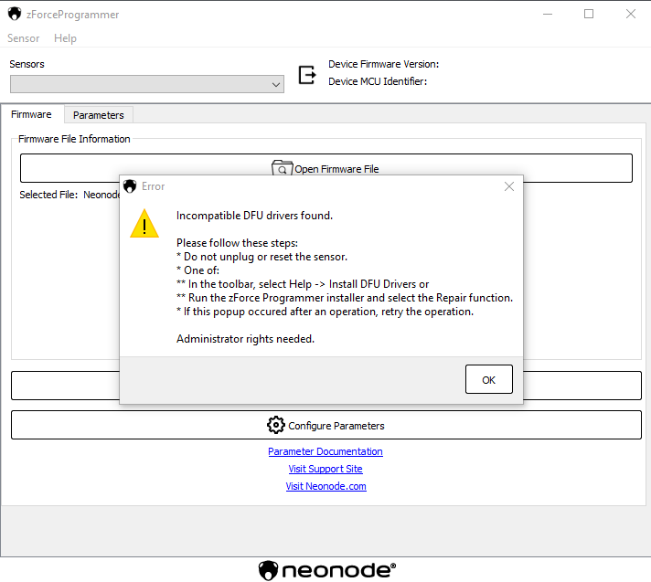 When zForceProgrammer detects incorrect DFU drivers being used it will display an error message and guide the user in installing correct drivers.