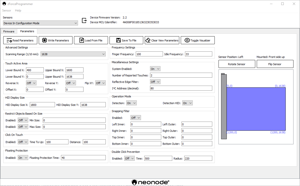 The visualizer displays the Touch Active Area in relation to the sensor and it's position, updating automatically as the parameter values are changed. The position of the sensor and its orientation can be changed by using the buttons above the visualizer area.